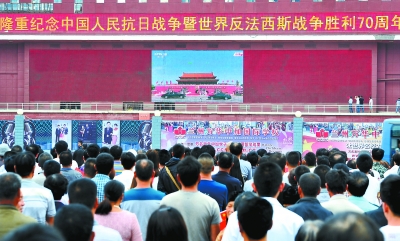 9月3日,市民在兰州东方红广场观看电视直播中国人民抗日战争暨世界反法西斯战争胜利70周年纪念大会和阅兵仪式。