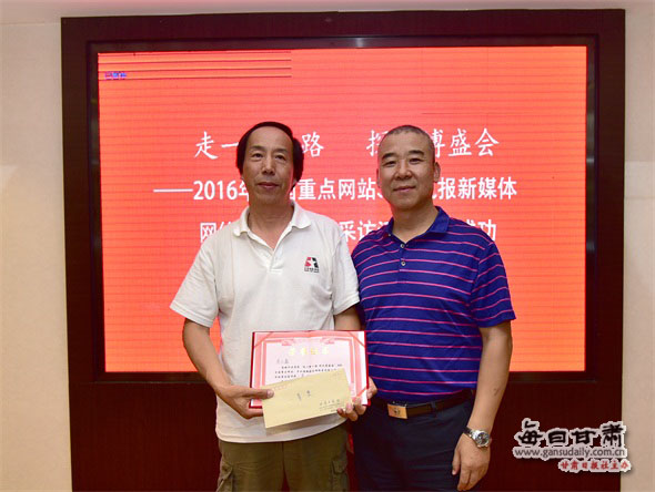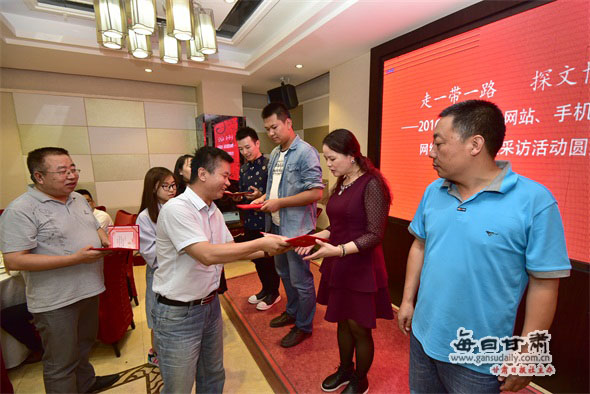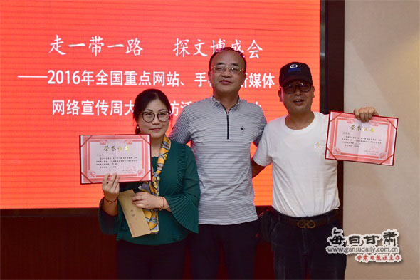 每日甘肃网兰州讯(记者韦德占)9月4日晚,由甘肃省委宣传部和省委网信办指导,甘肃日报社主办、每日甘肃网承办的“走一带一路 探文博盛会——‘聚丰杯’2016年全国重点网站、手机报新媒体网络宣传周”大型采访活动在兰州圆满落幕,省委网信办副主任王国强、甘肃日报社副总编辑张建伟等领导出席颁奖仪式。