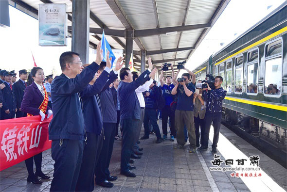 首趟嘉峪关至镜铁山冰川观光旅游列车盛装开行。(记者韦德占/摄)