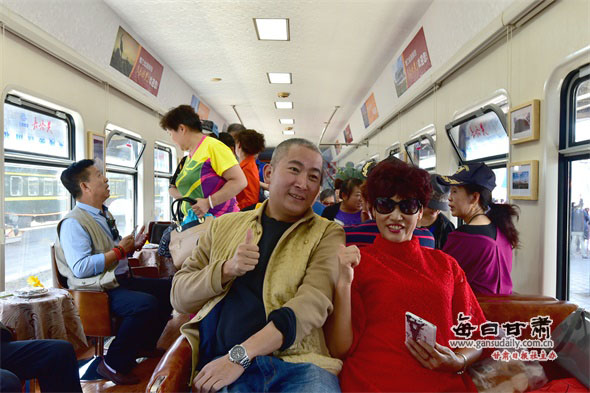 旅客点赞“兰铁旅游”一一冰川观光旅游列车。(记者韦德占/摄)