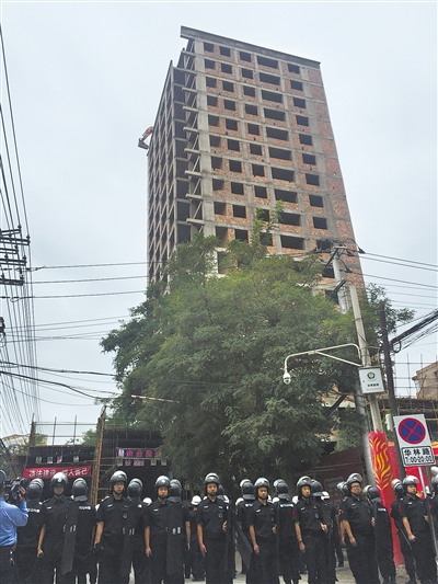 当日上午10时,兰州晨报记者在强拆现场了解到,在拆除之前,由于华林路过往车辆、行人较多,为了保证车辆、行人的安全,七里河区城管执法局提前一个月在18层高违章建筑的东侧安装了三层防护棚。同时,在拆除正式开始之前,执法人员在交警部门的配合下,对华林路进行了短暂的封闭。