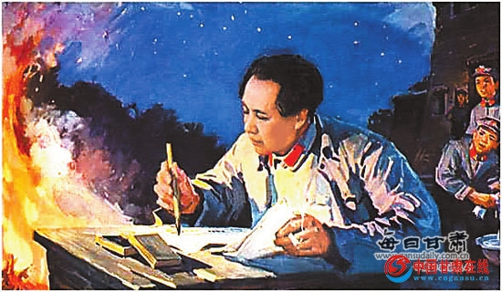 夜晚,毛泽东借着火光,撰写指导中国革命临潭新城的雄文(长征题材油画)沈尧伊