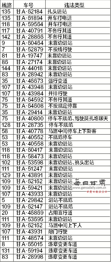 (兰州晨报首席记者 裴强)近日来,兰州公交集团、兰州市城运处分别对主城区道路交通管理专项督查行动督查组督查发现的公交车、出租车违法行为进行了严肃处理。