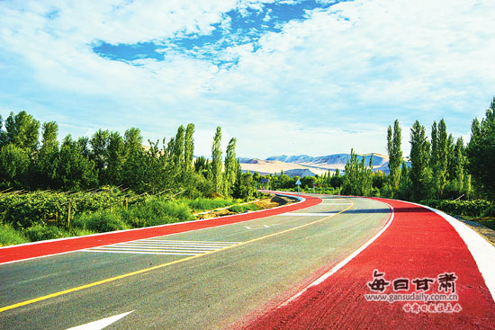 蓝天白云,绿树相映成趣。全长33公里的敦煌鸣沙山彩色景观大道正式建成通车。驶入景观大道,道路两旁如红丝绸般延展开来的彩色罩面便映入眼帘,给湛蓝的天空平添了几分生气。对于看惯了黑色柏油马路的市民来说,这样的道路的确是养眼,走在上面的感觉也非常舒适。