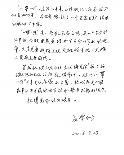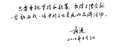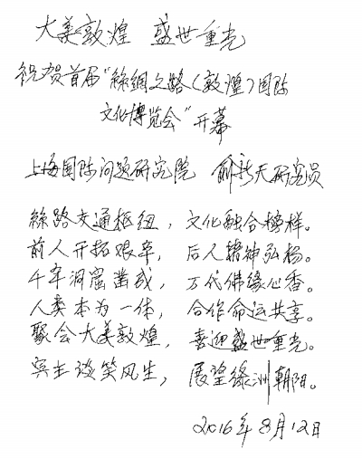 文化交流是永恒的话题,和平发展是全人类追求的目的。敦煌,是丝路的起点,是国际交流的纽带。在21世纪的今天,再次从敦煌出发,从首届丝绸之路(敦煌)国际文化博览会出发,不断创新,加强合作,必然有和平发展更美好的明天。 2016年8月