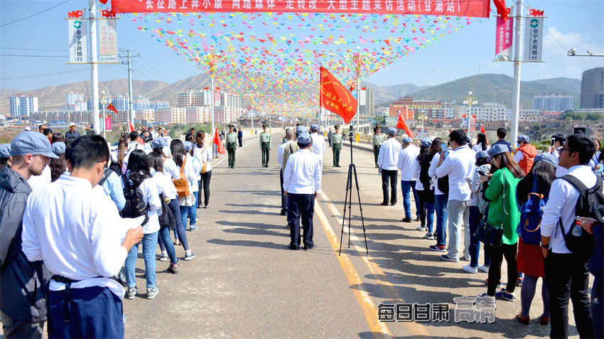 采访团一行列队齐步通过会师桥。(每日甘肃网记者韦德占/摄)
