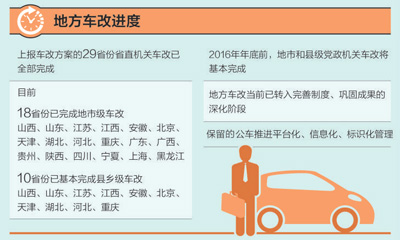 中央车改办表示,地方车改工作进展顺利。29个省份省直机关车改已全部完成,18个省份已完成地市级车改,其中10个省份基本完成了县乡级车改。按部署要求,地市和县级党政机关车改将于2016年底前基本完成。目前,地方车改的工作重点已转入完善制度体系、巩固车改成果的深化阶段。