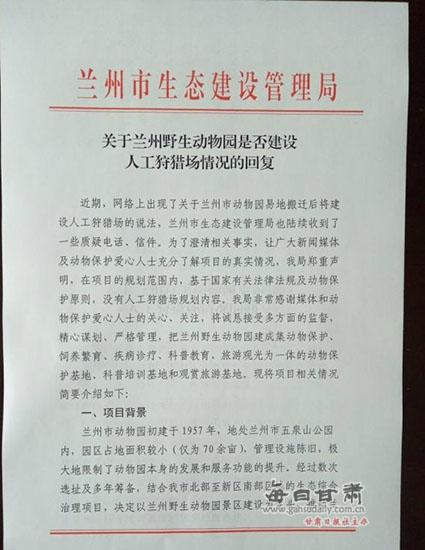 中国甘肃在线讯 近日,网络上出现兰州市动物园易地搬迁后将建设人工狩猎场的说法,兰州市生态建设管理局昨日发文回复表示也陆续收到一些质疑电话、信件,郑重声明称“在项目的规划范围内,基于国家有关法律法规及动物保护原则,没有人工狩猎场规划内容”。