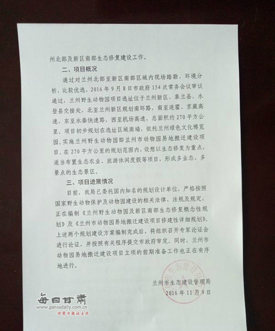 兰州市生态建设管理局在回复中表示,已委托国内知名规划设计单位,严格按照国家相关法律、法规及规定,正在编制《兰州野生动物园及新区南部生态修复概念性规划》及《兰州市动物园易地搬迁建设项目修建性详细规划》,并将组织召开专家论证会进行论证,提交市政府审定。同时,动物园易地搬迁建设项目立项的前期准备工作也在有序进行。