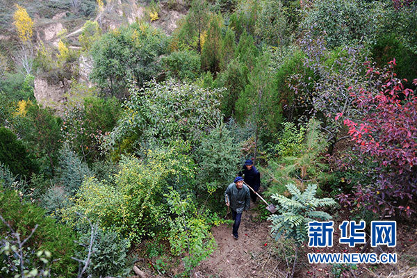 许志强(前)和许志刚从树林里走过,其中不乏已经成活的南方树种(10月16日摄)。新华社记者陈斌摄