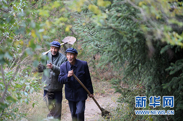 许志强(左)和许志刚扛着铁锹走过种着侧柏和云杉的小道(10月16日摄)。新华社记者陈斌摄