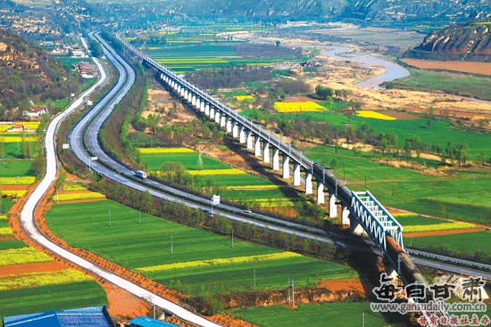 中国甘肃在线讯 构建立体路网,铁路、高速公路、普通公路同时运行,开启庆阳交通新格局。图为一列火车通过银西铁路长庆桥段。本报通讯员赵彩霞
