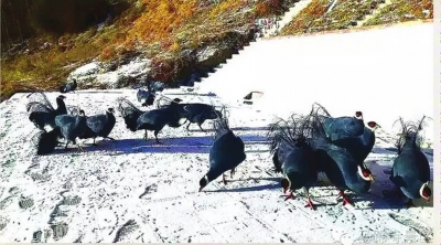 中国甘肃在线讯 张掖市肃南县马蹄寺附近平均海拔在2600米以上,常年偏冷,尤其在冬季,大部分地方被积雪覆盖,甚少有鸟儿出现。但是近日以来,蓝马鸡(二级珍惜鸟类,终年留居于青海东北部和东部)出现在肃南马蹄寺一带,景区工作人员发现后,进行了投食喂水。12月4日,蓝马鸡在马蹄寺景区悠闲踱步,并跟拍照游人出现了亲切“互动”。(来源:每日甘肃网)