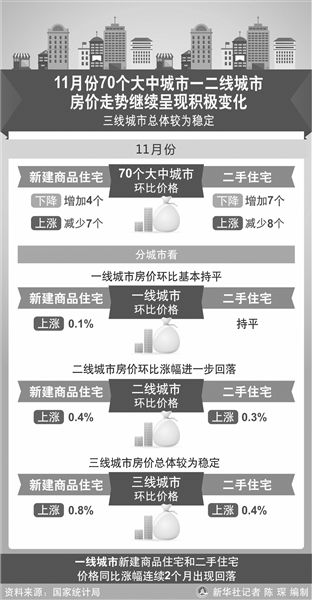 国家统计局数据显示,11月份全国热点城市房价趋稳,其中京沪深止涨,未来部分城市房价水平将继续回落。另据易居研究院数据显示,三线城市楼市转暖,11月份新建商品住宅成交面积同比增长52%。
