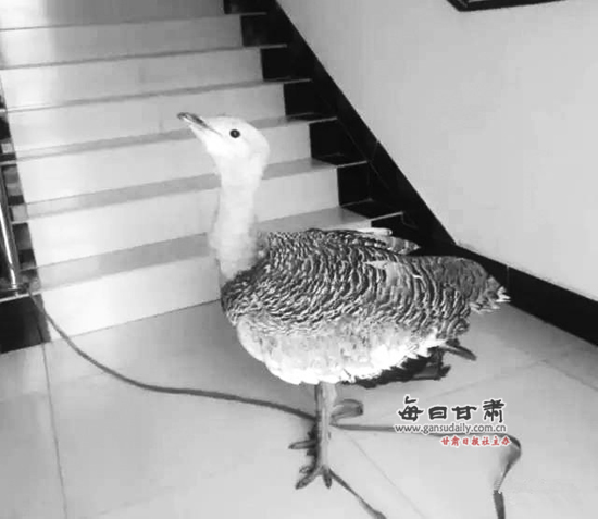 中国甘肃在线讯 12月19日,兰州晨报记者从庆阳市森林公安局了解到,日前,庆城县马岭镇一群众捡到了一只翅膀腋下受伤“落难”的大鸟。随后,民警在对大鸟的伤口进行了初步包扎后送往陇东地区濒危野生动物救助中心做进一步的观察救治。通过查询资料,民警得知“大鸟”名叫大鸨(音:bǎo),是国家保护的一级野生动物,国际鸟类保护委员会(ICBP)已将其列入世界濒危鸟类红皮书。大鸨在我国曾经种群数量较多,如今已相当稀少,估计总数仅存300-400只,其稀有程度超过大熊猫。(来源:每日甘肃网)