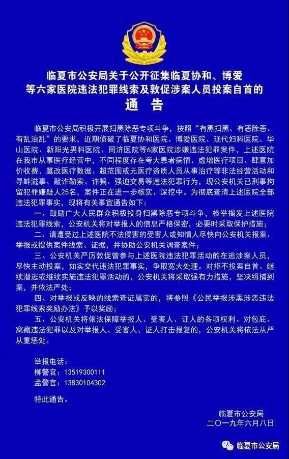 根据临夏市公安局发布的通报显示,6家医院包括临夏协和医院、博爱医院、现代妇科医院、华山医院、新阳光男科医院、同济医院。