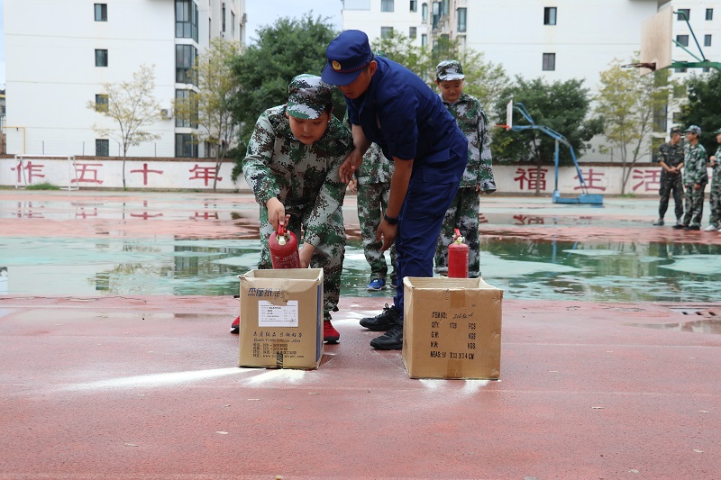 在操场,大队宣传人员手把手教该校新生灭火器的正确使用方法以及注意事项,为检验学习成果,学生们代表轮流上台进行体验。在大队宣传人员的指导下,学生们提起灭火器,按照之前宣传人员所传授的动作要领进行灭火体验,亲身参与,搏斗“火魔”,实战“灭火”。