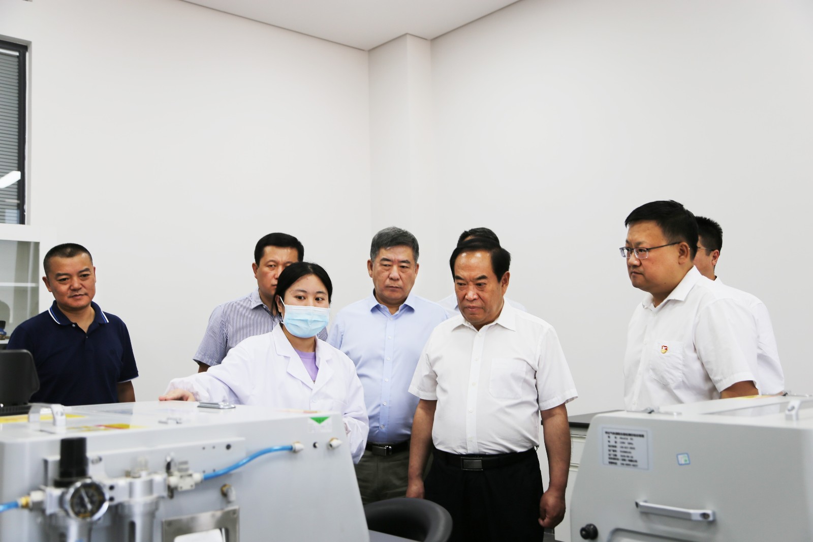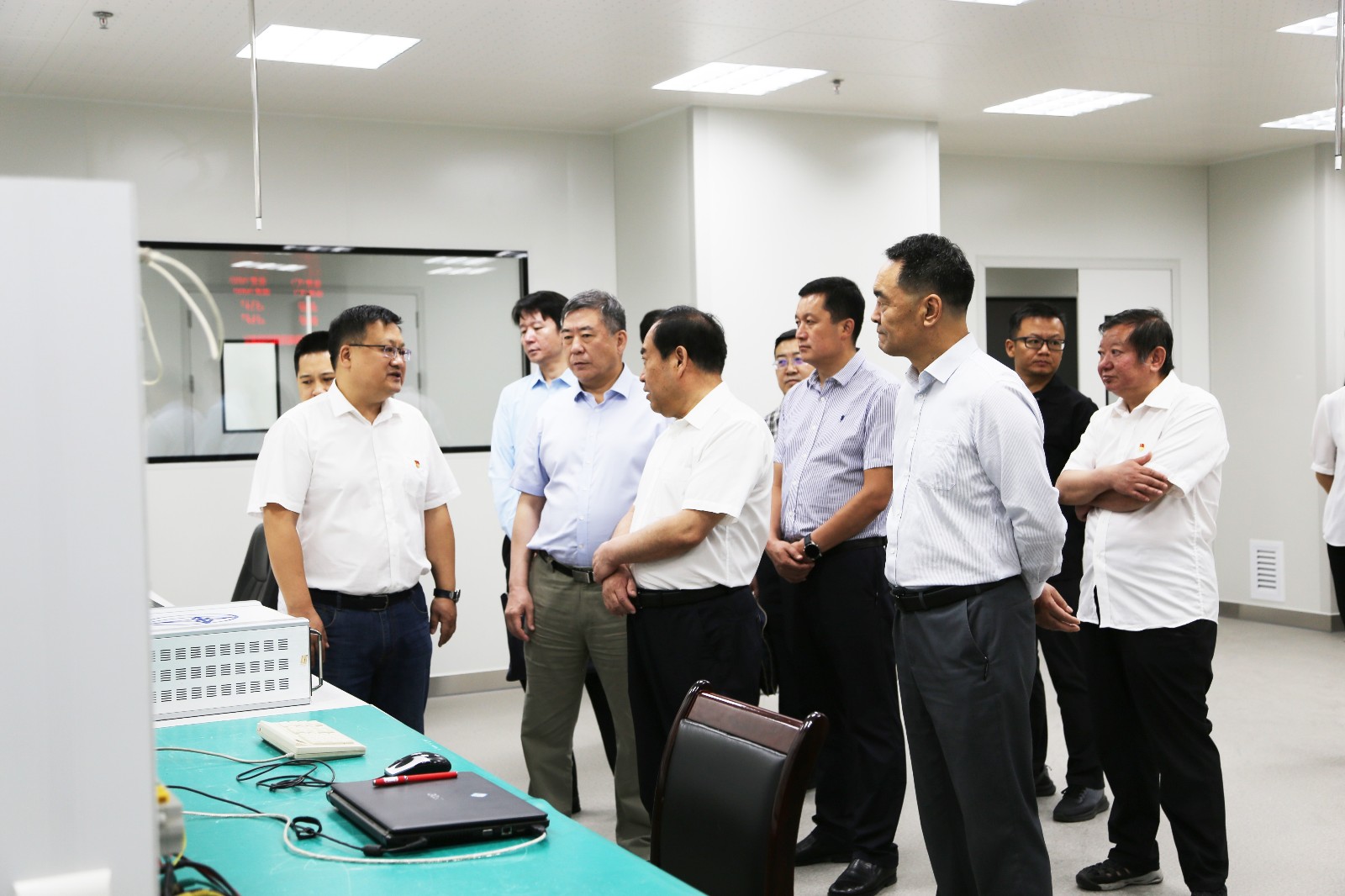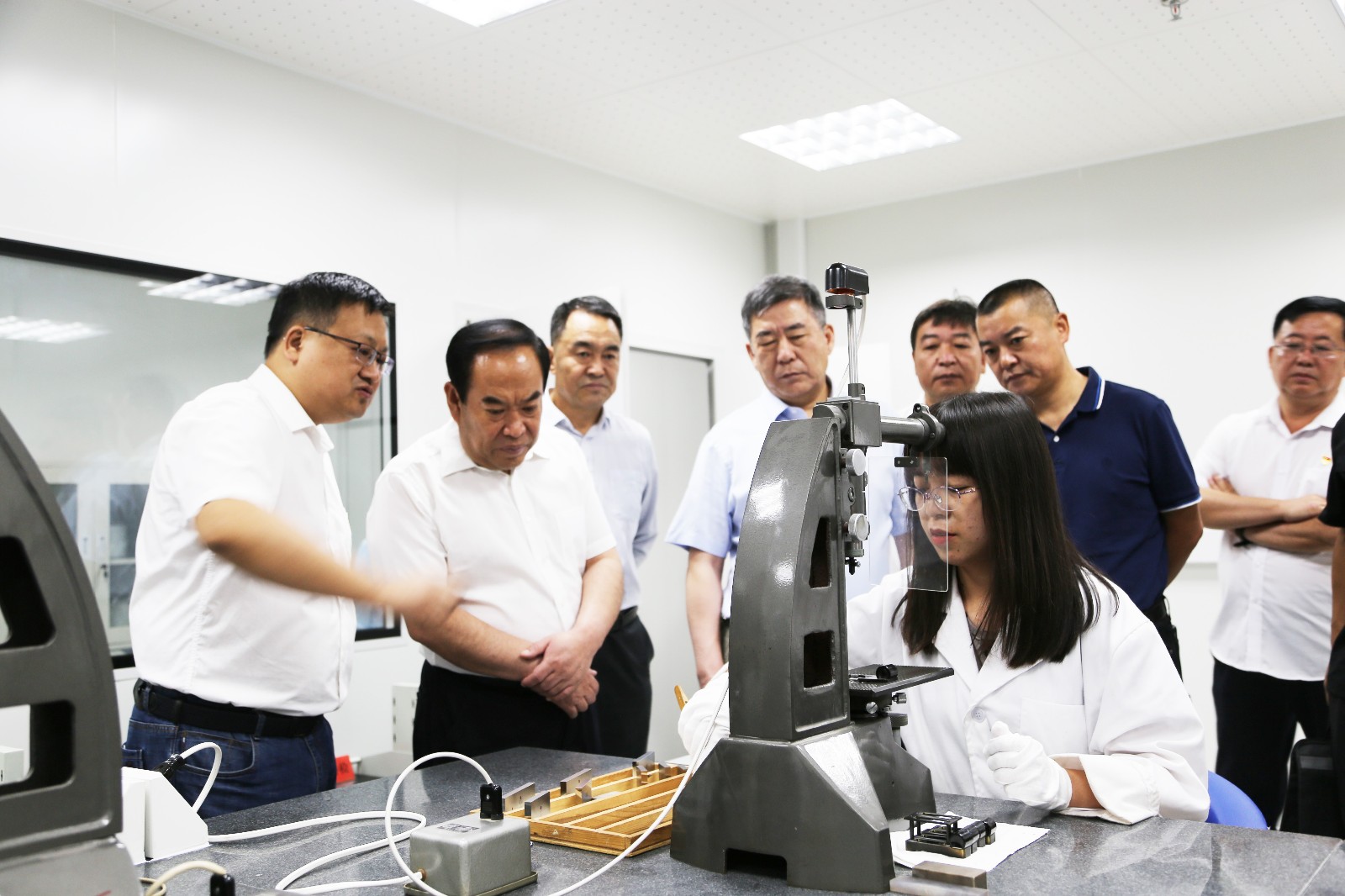 王忠习一行在察看了省计量院客服大厅后,依次观看了理化计量研究所、热工计量研究所、力学计量研究所等专业计量所,具体察看了负一楼三坐标恒温实验室、量块恒温实验室、天平恒温实验室、热工所精压实验室等,听取了院相关领导对实验设备性能、功用的介绍及对检测工作情况的汇报。