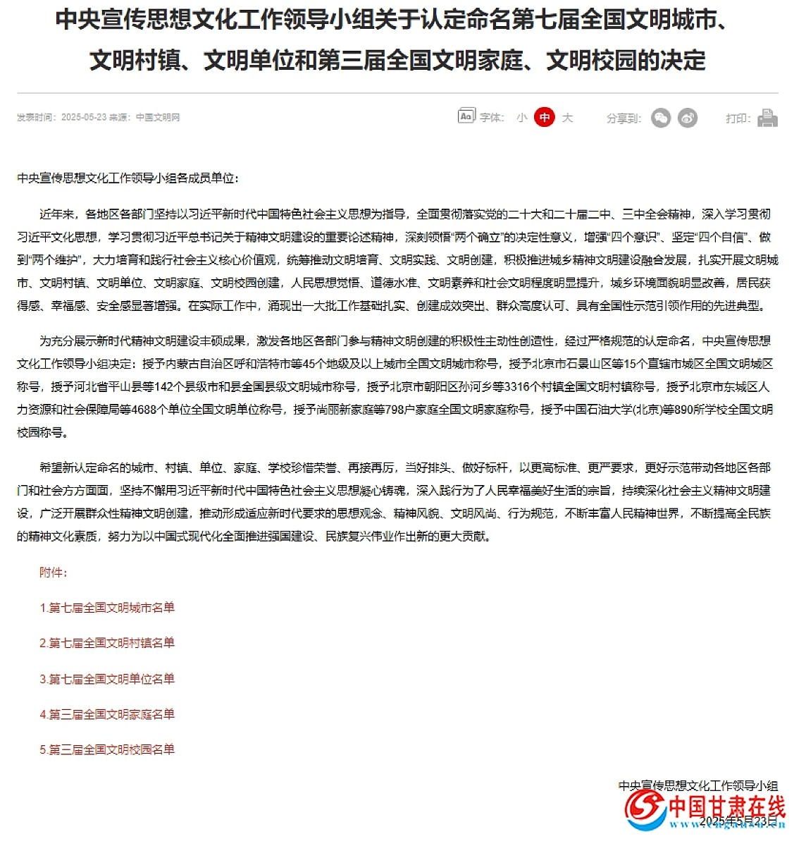 中国甘肃在线讯 5月23日,中央宣传思想文化工作领导小组发布《关于认定命名第七届全国文明城市、文明村镇、文明单位和第三届全国文明家庭、文明校园的决定》,甘肃省计量研究院被授予“全国文明单位”称号,这也是全国精神文明建设领域的最高荣誉。