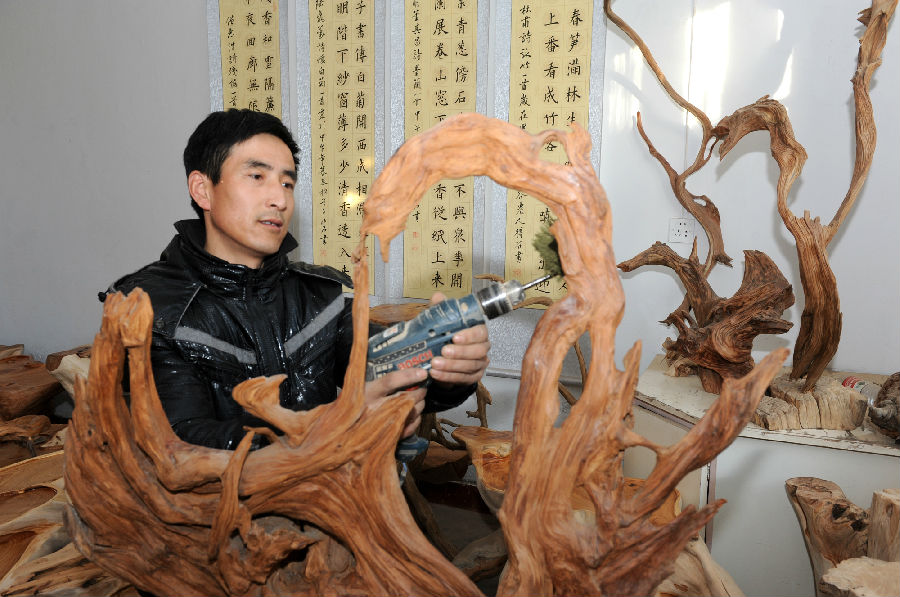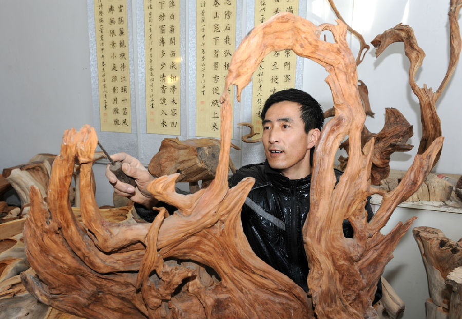 麦积区:刘世平的根雕艺术作品走俏大都市