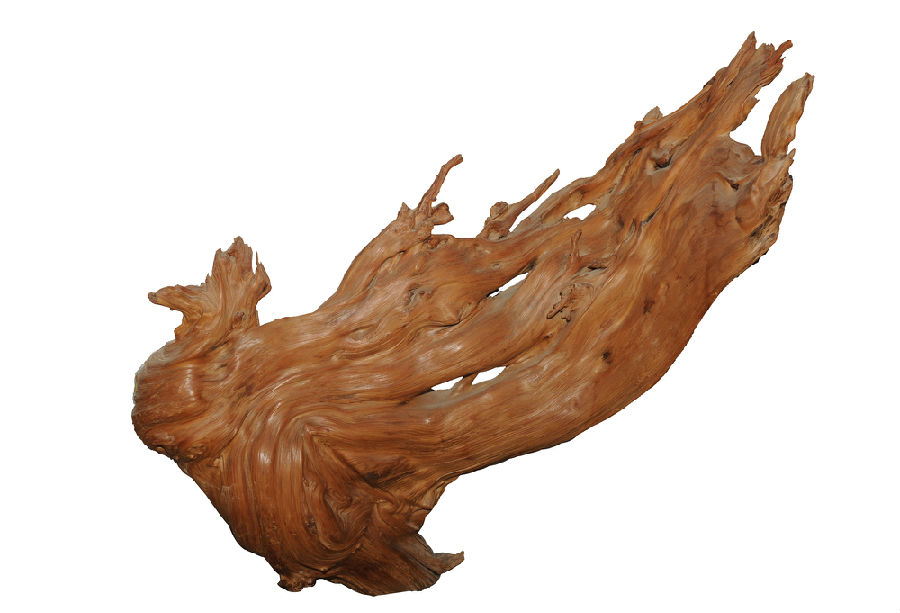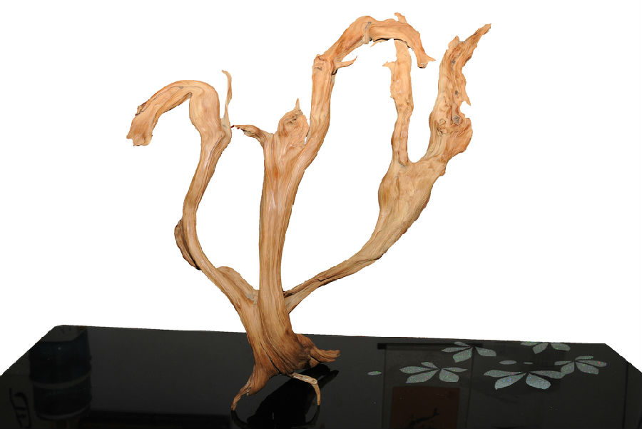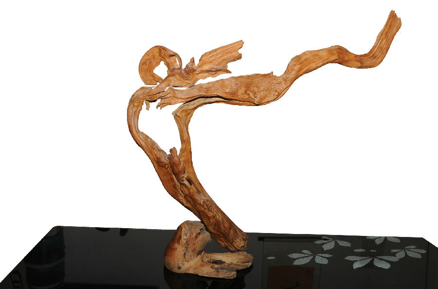 刘世平告诉笔者,这些作品是用在山崖石头缝里生长多年的树根制成,有香柏木、核桃木、对节刺等,有几件作品是他在陕西秦岭山脉一偏僻的小山村悬崖下的溪水中卷裤腿摸捞上来的崖柏制成的。
