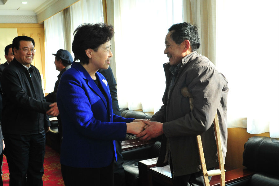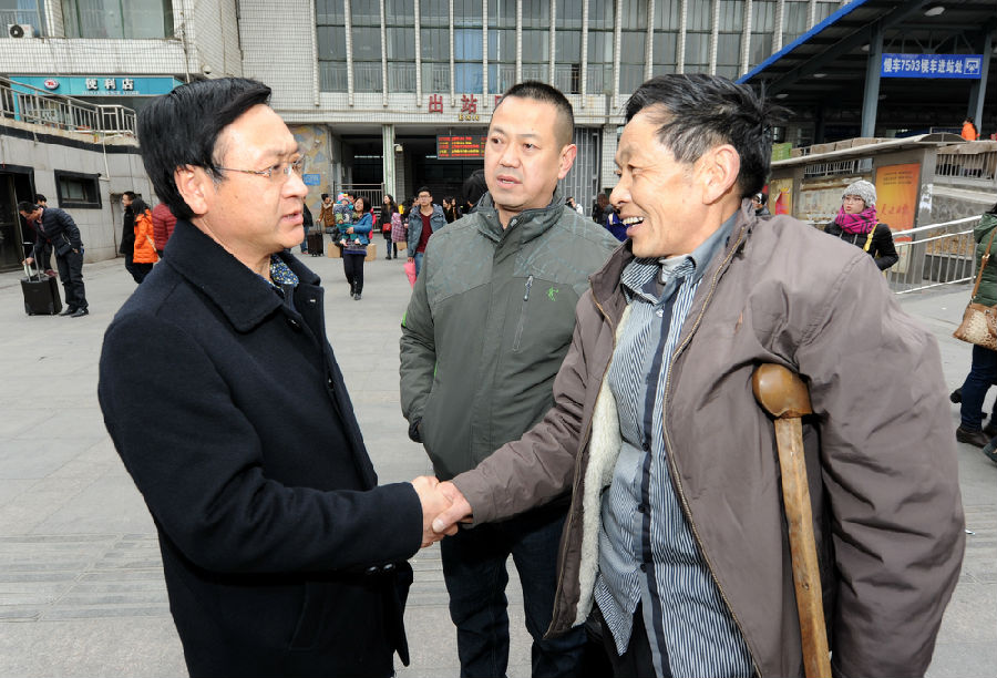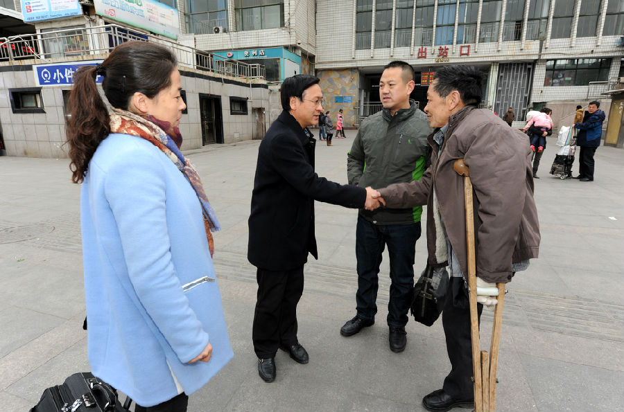2月1日下午3时许,刚刚在兰州参加完甘肃省2014年度“陇原最美乡村医生”颁奖典礼的天水市麦积区元龙镇石家湾村“独腿”村医贺先敏载誉归来,在天水市卫生和计划生育委员会党委委员、纪委书记成科峰陪同下缓步走出天水火车站。