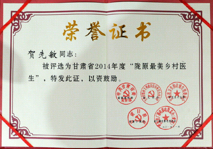 1月31日,由省委宣传部、省文明办、省卫生计生委、甘肃日报社和省广电总台联合举办的“陇原最美乡村医生”颁奖活动隆重举行。活动现场,王万青、穆荣肖、裴正学和沈为众四位甘肃卫生计生行业先进典型,分别为的10名“陇原最美乡村医生”获得者颁奖。麦积区元龙镇石家湾村“独腿”村医贺先敏从全省2万多名、全市2000多名乡村医生中脱引而出受到表彰。受到省委常委、副省长咸辉,省政府副秘书长张正锋的亲切接见。这是天水市唯一评选为甘肃省2014年度“陇原最美乡村医生”称号的乡村医生。