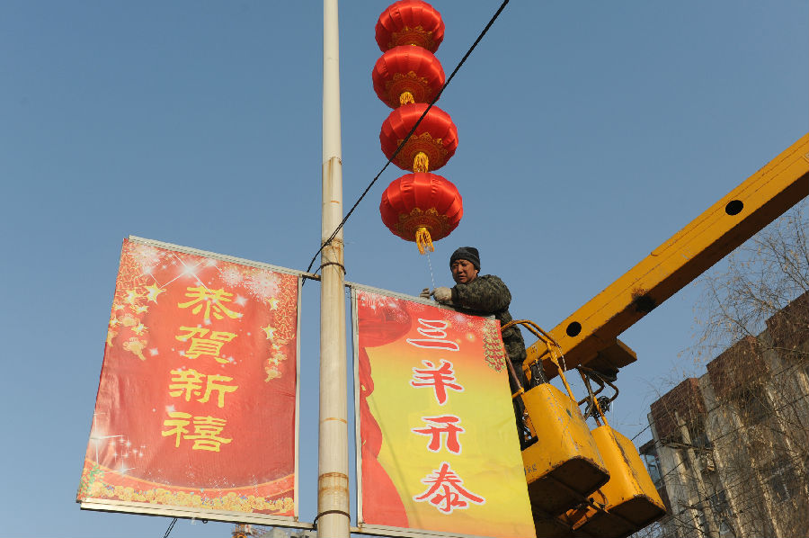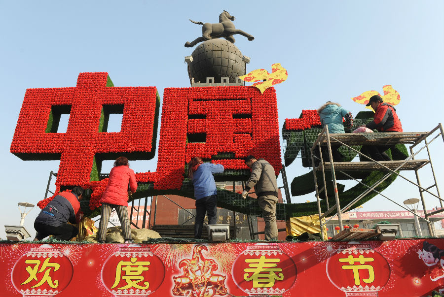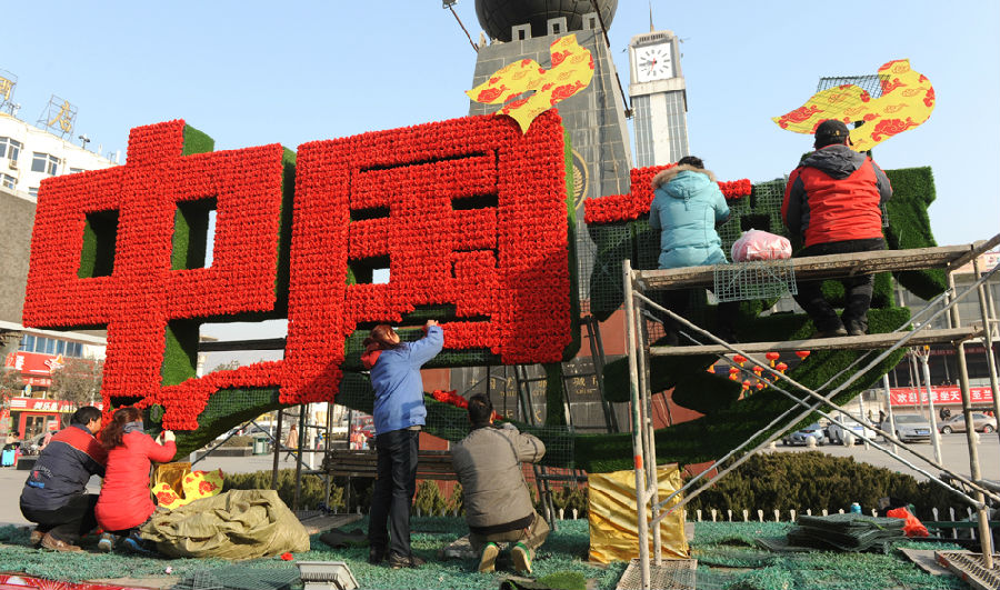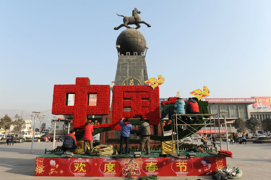 2月12日,天水市麦积区园林工作人员正在火车站编制“中国梦”大型绢花雕塑。春节将至,麦积区大街小巷张灯结彩,处处洋溢着浓郁的喜庆、祥和节日气氛,全城宛如穿上火红的靓装,喜迎新春佳节。(窦耀辉)