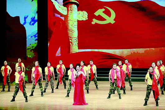 6月29日,演员正在表演歌伴舞《报答》,当日,平凉市纪念中国共产党成立94周年文艺晚会在平凉剧院隆重举行。本报记者杨昕摄