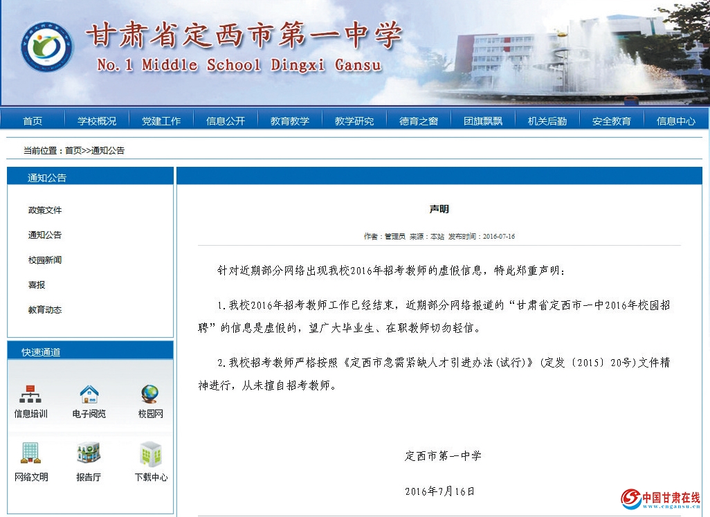 微信公号的“招聘信息”竟是“淘”来的男子报名被骗189元 “甘肃招聘”运营方竟称被骗者防范意识不足定西市一中就网络上的虚假招聘信息发布的声明。网络截图  日前,毕业于甘肃农业大学的小陈在一个微信认证公号“...