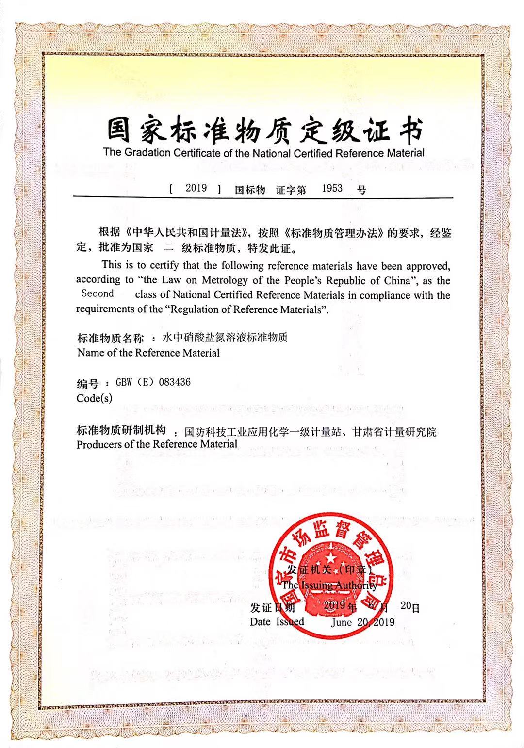 • 甘肃省计量研究院研制的水中硝酸盐氮溶液标准物质获得国家总局标准物质定级证书