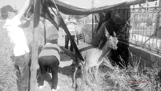 管护站工作人员积极救助受伤马鹿。本报通讯员李海军 记者曹勇摄  兰州晨报张掖讯(通讯员李海军 记者曹勇)一只国家二级保护动物野生马鹿身体受伤无法行走,幸被群众发现并向肃南县隆畅河自然保护站老虎沟资源管护站...