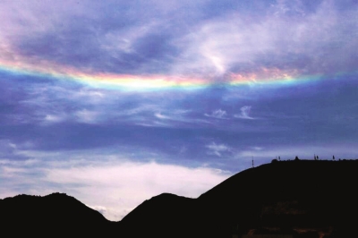 城关区铁路局附近的“彩云”  据兰州日报报道 “你看,你看,那是彩虹吗?”“好像不是彩虹,好像是彩云!”8月5日中午时分,很多市民都看到了一条色彩斑斓的云朵倒挂在天边的景象,很多人纷纷拿起手中的手...