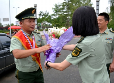 (马国贞摄)  8月3日下午,赴京参加“中国武警十大忠诚卫士”颁奖典礼的马赵飞同志回到兰州,武警甘肃省森林总队陈长生总队长带全体机关干部和直属队官兵盛情迎接英雄载誉归来。八一建军节前夕,第十八届“中国武...