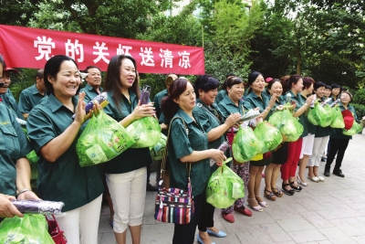 送清凉城关开展公益活动慰问3000多名环卫绿化工人  据兰州日报报道近几天,我市持续出现高温天气,为有效防控职工们高温中暑,城关区号召区直机关工委和工会、妇联及团委等发扬群团组织作用,在城关区委组织部的积...