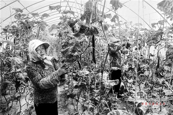 华亭县东华镇黎明川现代农业示范园内菜农正在采摘黄瓜。今年,华亭县大力发展蔬菜产业,新建改建连栋蔬菜拱棚24座、大棚1200座,带动全县种植蔬菜10万亩。  本报通讯员 张小兵...