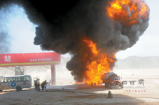 “暴徒袭击加油站,请立即支援!”皋兰县组织多部门举行反恐处突消防实战演练加油站“遇袭”现场。本报记者李升特约记者魏存武摄抓捕“暴恐”分子。  兰州晨报讯(记者李升)“暴徒袭击加油站,请立即支援!”7月30日...