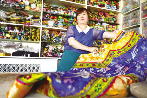 7月30日,在肃南裕固族自治县一家民族手工艺品店里,一位工人展示手工制作的裕固族传统服饰。  据了解,裕固族是甘肃特有的三个少数民族之一,人口14000多人,主要居住在位于河西走廊中部、祁连山北麓的裕固族...