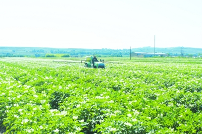 近年来,定西市安定区不断强化马铃薯标准化示范基地建设,带动全区马铃薯种植继续稳定在100万亩以上,有效提升了富民产业发展水平。图为甘肃凯凯农业科技发展股份有限公司员工正在开展机械化作业,加强马铃薯晚疫...