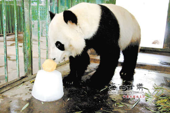 7月28日,在兰州市动物园,大熊猫“兰仔”在室内惬意地享受着冰块和美食窝窝头。连日来高温天气一直持续,为让动物能够清凉度夏,动物园工作人员采取喂冰冻水果、开足空调各种消暑降温办法,为园内动物消暑降温。...
