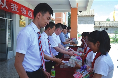 近日,临夏市穆斯林物流园区办公室、临夏市南龙镇马家庄村委会联合东风悦达起亚环球顺腾4S店向马家庄小学捐赠了价值21000元的辅导图书1500册,受到了广大师生的欢迎。图为正在发放捐赠图书。马春伟摄...