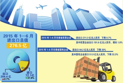 上半年我省进出口总值276.5亿元  进口出现新的增长点外贸出现筑底企稳态势  制图魏文雅  据兰州日报报道2015年1-6月,甘肃省对外贸易进出口总值276.5亿元人民币,比去年同期下降8.7%;其中出口总值204.4亿元人...