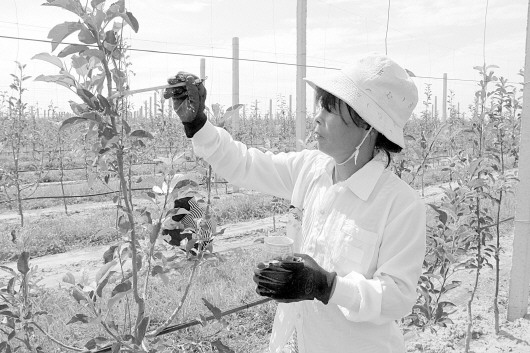 • 灵台工人正在为冰雹打伤的果树涂刷药剂