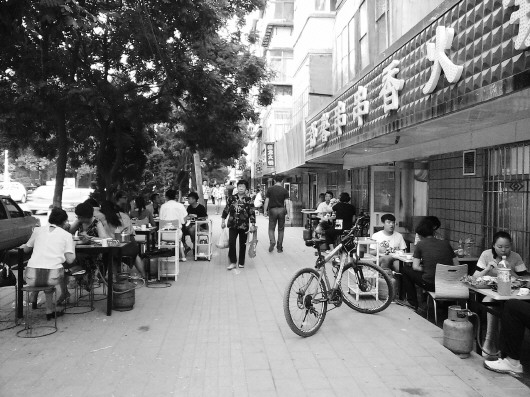 图为东山路一家串串香火锅店占道经营。  前不久,本报报道过市区双合路商户占道经营的现象,这些商户将自家的餐桌摆放在店铺前的人行道上,影响了市民的正常出行。无独有偶,近日记者途经市区东山路看到,一家串串香...