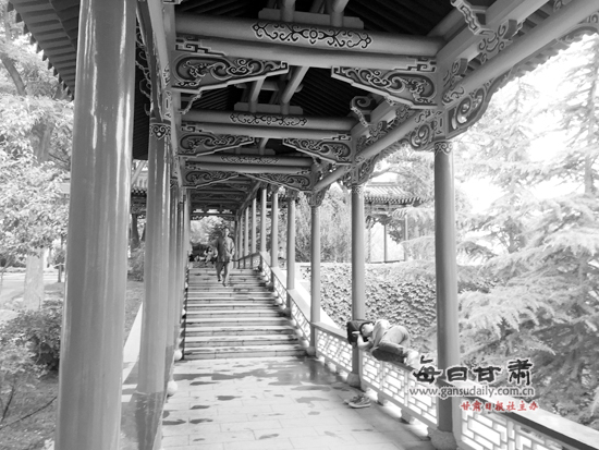 近日,记者在白塔山公园看到,一名游客舒展地躺在园内长廊里,旁若无人地熟睡。身旁游人如织,如此不文明游园方式着实不雅,令美景大打折扣。本报记者夏苗摄...
