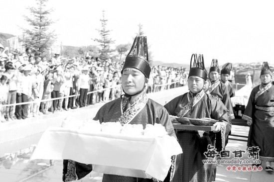 祭祀人员在渭源县举行的祭祀大禹典礼仪式上献祭贡品。新华社照片  兰州晨报讯(记者王学涛 实习生马艳) 情牵甘陕两省八百秦川,梦绕渭河两岸华夏子孙。2015(乙未)年渭源县祭祀华夏文明先祖大禹典礼盛大活动于7月21日...