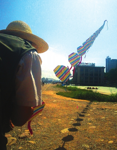 7月21日上午,在黄河风情线近水广场上空众多的风筝中,最引人注目的就是“丹霞风筝”了。风筝的主人丁进财说,2005年他开始放“丹霞风筝”,这个风筝长达460米,串有720多片,在风力达到二三级时,可以放飞到200...