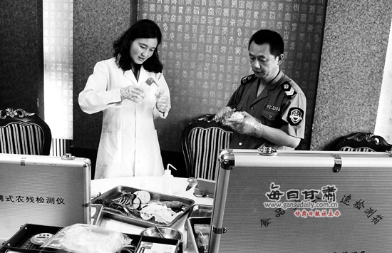 近日,成县食品药品检验检测中心工作人员对酒店蔬菜进行抽样检测,确保群众夏季食品安全。本报通讯员 张平良...