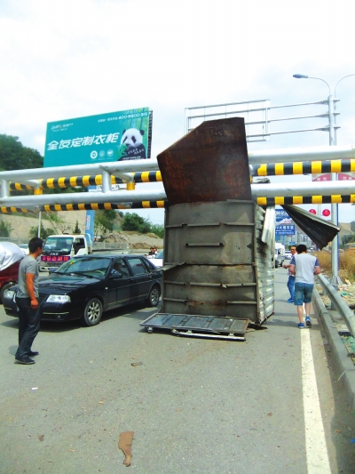 货车集装箱掉落  司机被送往医院  货车撞上限高杆一名司机受重伤  东岗立交桥今年以来已发生4起类似事故  据兰州晚报报道(首席记者孙建荣 实习生刘哲文/图)7月21日下午,一辆载有集装箱的货车在东岗立交...