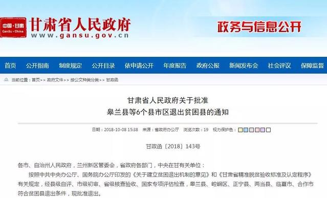 10月8日,省政府办公厅发布《甘肃省人民政府关于批准皋兰县等6个县市区退出贫困县的通知》,皋兰县、崆峒区、正宁县、两当县、临夏市、合作市符合贫困县退出条件,现批准退出。